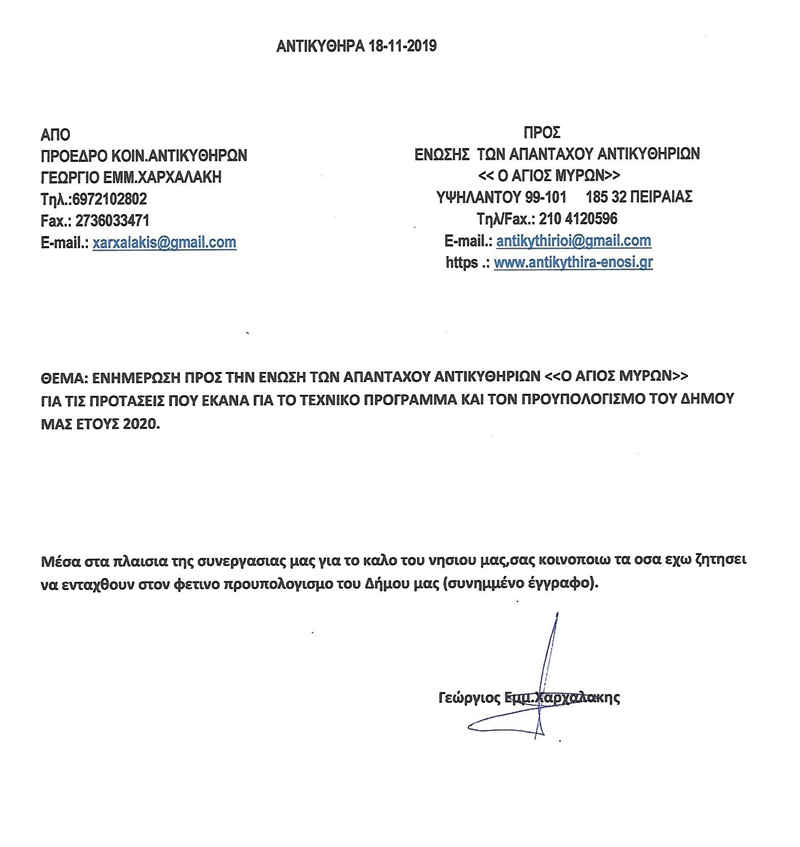 - ΕΥΧΑΡΙΣΤΙΕΣ ΤΟΥ ΠΡΟΕΔΡΟΥ ΤΗΣ Δ.Κ.ΑΝΤΙΚΥΘΗΡΩΝ ΠΡΟΣ ΤΟΝ ΓΕΩΡΓΙΟ ΕΜΜ.ΧΑΡΧΑΛΑΚΗ