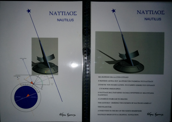 Ο κ. Γαλανάκης μας ξενάγησε με λεπτομέρεια στα έργα που εκθέτει και -στο τέλος- μας επιφύλαξε μία έκπληξη : Μας παρουσίασε το Ηλιακό Ρολόϊ "ΝΑΥΤΙΛΟΣ" που το φτιάχνει ειδικά για το νησί μας, στο οποίο και θα το δωρίσει.