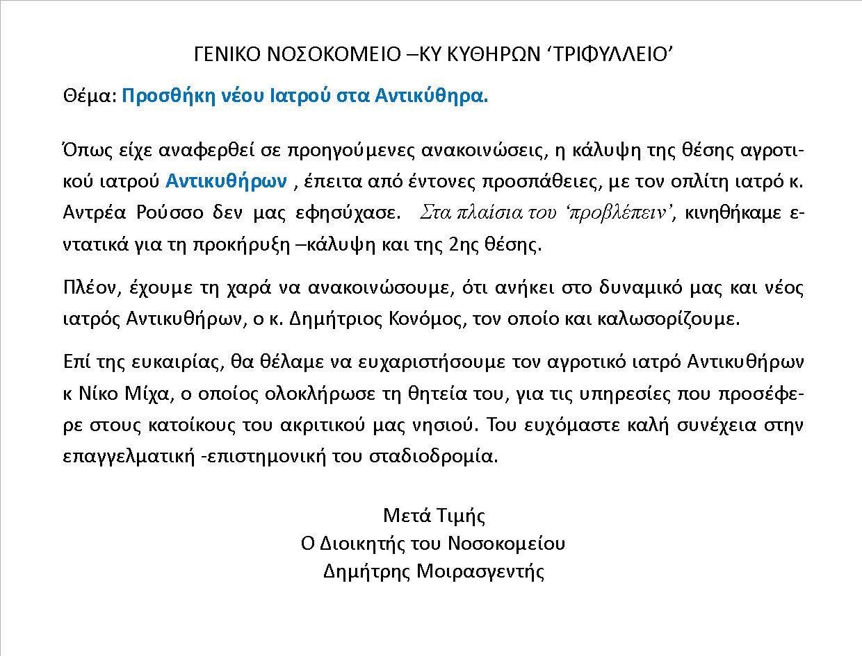 - ΔΙΟΡΙΣΜΟΣ ΙΑΤΡΟΥ ΣΤΑ ΑΝΤΙΚΥΘΗΡΑ