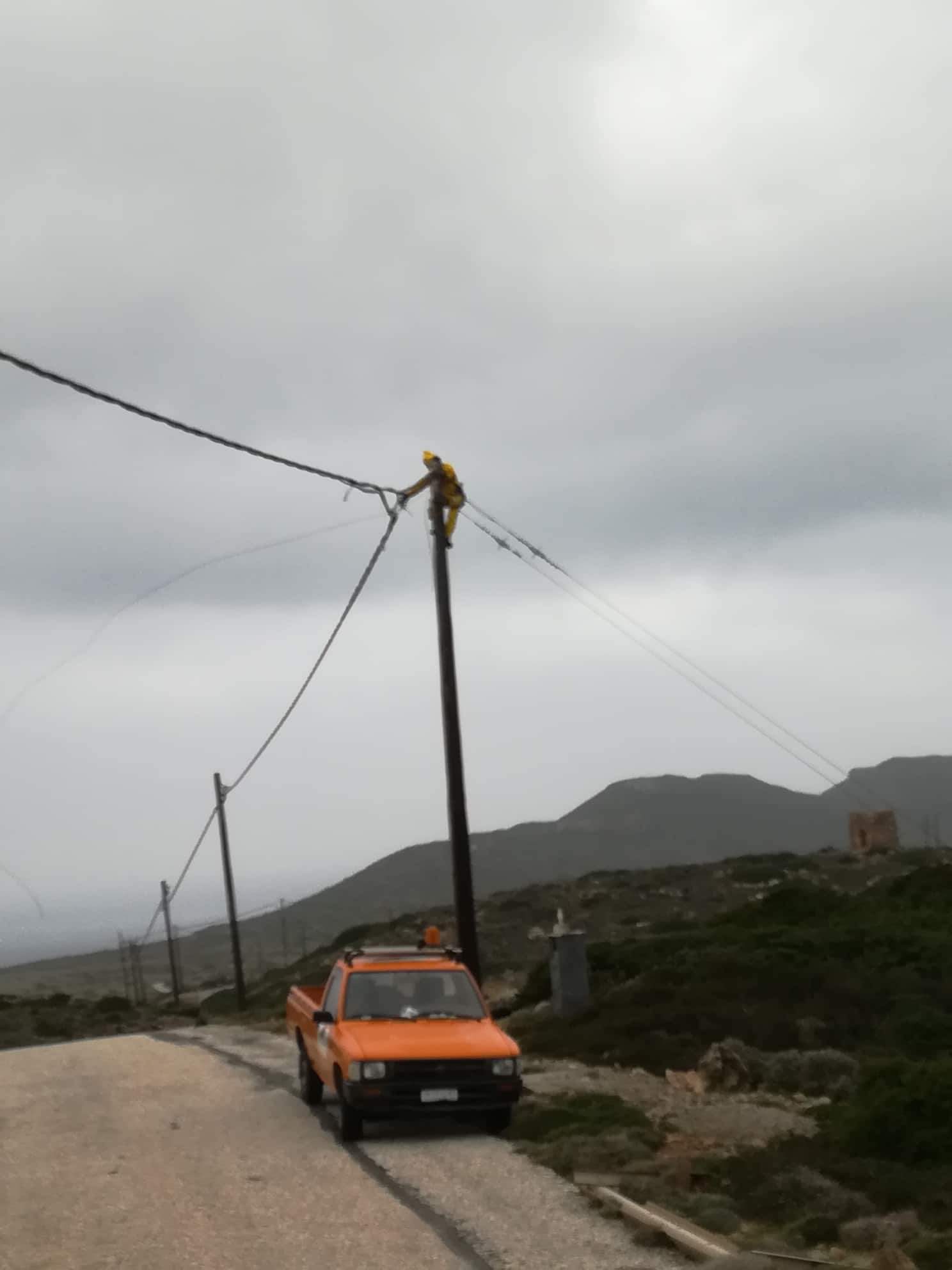 (σ.σ. Πρόκειται για τον Γιώργο Χαρχαλάκη του Εμμανουήλ, ο οποίος νυχθημερόν "περιπολεί" και παρακολουθεί τις συνδέσεις στις κολώνες της ΔΕΗ, και -σε έκτακτες καταστάσεις, με κίνδυνο της ζωής του, χωρίς να έχει καμμία υποχρέωση- ανεβαίνει και αποκαθιστά τις βλάβες).
