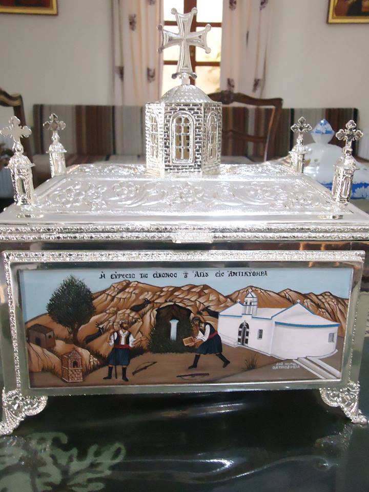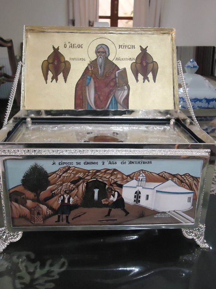 Το ευωδιάζον Ιερόν Λείψανον φιλοξενήθηκε σχεδόν επί δίμηνον στην Ιερά Μονή Αγίων Πάντων Σπετσών καθόλο το διάστημα κατασκευής της περίτεχνης ασημένιας λειψανοθήκης, τη δαπάνη για την οποία κάλυψαν Αντικυθήριοι και φιλο-Αντικυθήριοι από την Ελλάδα και το εξωτερικό (η αναλυτική κατάστασις των δωρητών θα δημοσιοποιηθεί μετά το Πάσχα).