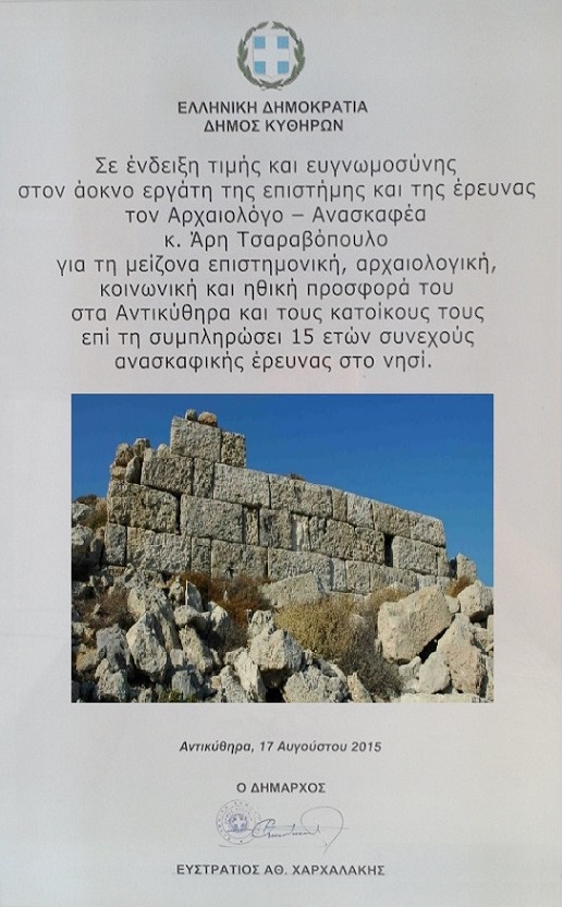 Ανήμερα της εορτής του Πολιούχου των Αντικυθήρων τιμήσαμε ως Δήμος Κυθήρων και Αντικυθήρων τον Αρχαιολόγο και Ανασκαφέα κ. Άρη Τσαραβόπουλο που φέτος συμπλήρωσε 15 χρόνια συνεχούς εθελοντικής ανασκαφικής δραστηριότητας στα Αντικύθηρα.
